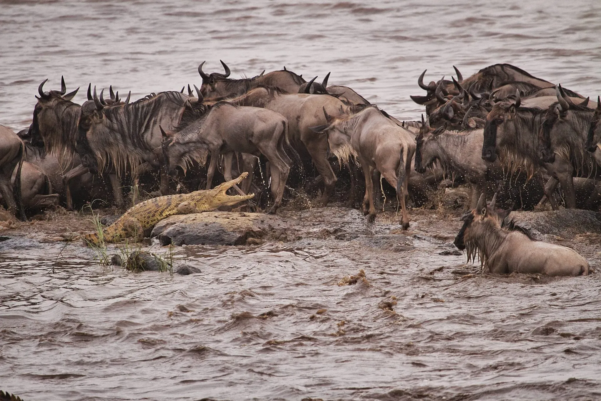 migrating wildebeest crossing the mara river